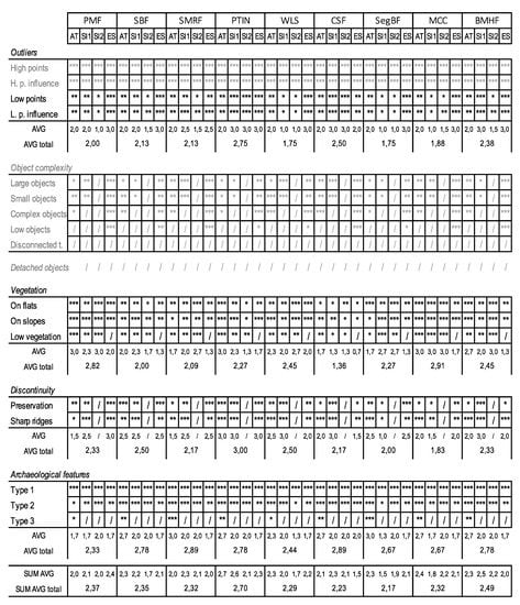In a similar vein, for the purposes of this study, some of the categories are irrelevant either because all filters perform good (high outliers) or because they are irrelevant to archaeology (object complexity, detached objects). Nevertheless, where present, these categories were still evaluated but are marked in grey.