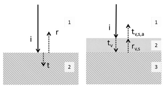 (Left) schematics of experiment I of the incoming (i), transmitted (t), and reflected (r) energy between medium 1 (typically air) and medium 2 (soil or vegetation). (Right) schematics of experiment II, with three media (1 = air, 2 = vegetation, and 3 = soil) with “t” as the transmitted energy from air to vegetation, “r” as the reflected energy from vegetation to soil, and ”t” as the transmitted energy from vegetation to air (i.e., back to the satellite). Transmitted energy from vegetation to soil and direct reflection from air to vegetation are not shown.