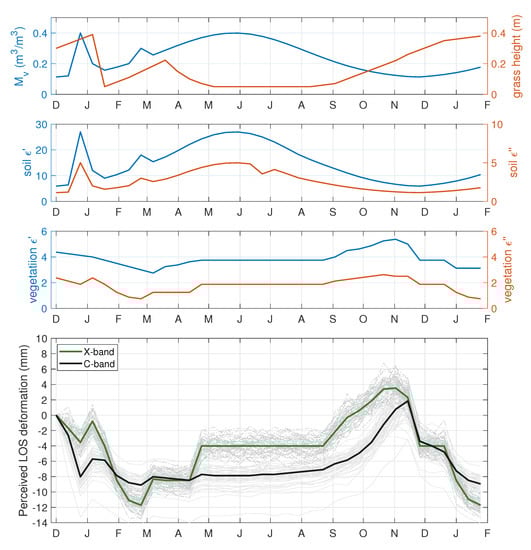 Hypothetical values of soil moisture (), grass height, and soil and vegetation permittivities (for C-band) over 14 months in a pasture without terrain motion (the top three plots) and the resulting synthetic perceived LOS deformation through phase disturbances (bottom plot) of C-band and X-band microwave radar: our “year in a paddock” included realistic scenarios of southern hemisphere pasture with (sub-)seasonal changes in soil and vegetation moisture due to some heavier showers (December and March), grass and soil drying out over summer (December to March), a grass-cut (January), cattle grazing (March–May), and grass not growing over winter (May–August).