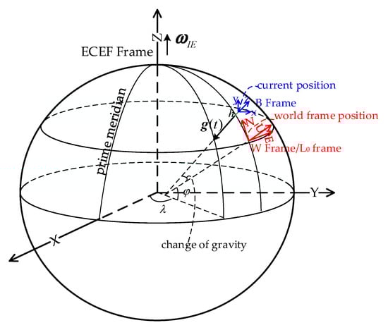 Set the position of the IMU at time t in the W frame as . Then, its position in the E frame can be calculated as follows: