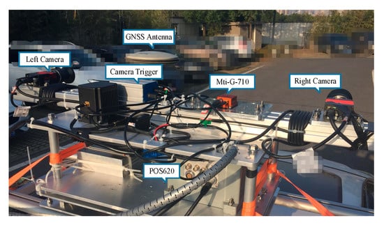 In order to evaluate the performance of the proposed IMU preintegration algorithm, we conducted experiments by using the dataset collected by our sensor platform. Our sensor platform consists of a left-right stereo camera and two different grades of IMU, as shown in Figure 2. The stereo camera consists of two Prosilica GT 1910 monocular cameras by AVT. Both of them are global shutter monochrome CCD cameras which deliver 1920 × 1080 images. The cameras are synchronously triggered by an Arduino Uno R3 microcontroller at 10 Hz. The microcontroller parses GPS time from the NMEA messages provided by Ublox NEO-M8N. The two cameras are equipped with LM8HC lenses by Kowa. The horizontal field of view of the lens is about 60 degrees. The two IMUs are MTi-G-710 and POS620, respectively. The MTi-G-710 is an industrial-grade MEMS-based IMU by Xsens. The POS620 is a quasi-navigation-grade IMU by the MPSTNAV company of China, and contains three-axis high-precision fiber optic gyroscopes (FOGs).