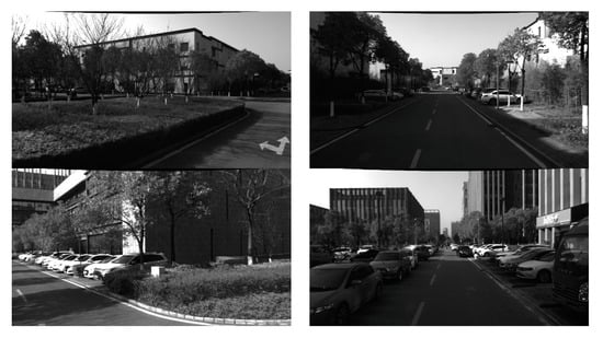 Our dataset contains two sequences collected at two different places in Wuhan city of China, namely the Wuhan Research and Innovation Center (WRIC) and the Guanggu financial harbor (GFH). There are many low-slung buildings and trees in the two places. These static objects provide a high-quality texture for visual measurements, as shown in Figure 3. Additionally, navigation satellite signals are not easily shielded or reflected in the two places. The GNSS raw data was recorded by the Trimble receiver. Furthermore, we used the GINS software developed by the MPSTNAV company of China to post-process the recorded GNSS raw data, in order to obtain high-precision real-time kinematic (RTK) positioning results.