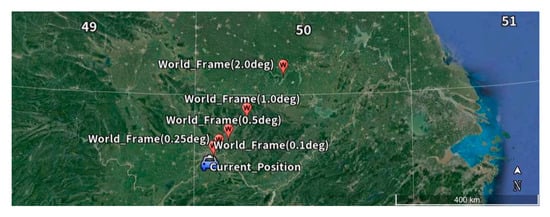 It is well-known that the earth is an approximate spheroid, and the direction of gravity approximately points to the center of the earth. Therefore, the direction and amplitude of gravity change with the position on the earth. For two positions that are far apart, the gravity vectors will be quite different. Therefore, it is imprecise for the traditional IMU preintegration algorithms to assume that the gravity vector is constant in the W frame, especially after the vehicle has traveled a long distance. An example is where the VINS system (maybe another system where the IMU preintegration technology is used) was initialized at city A and traveled to city B, where the W coordinate frame was located at city A. To simulate this situation, i.e., to amplify the influence of the change of gravity, we deliberately moved the W coordinate frame a certain distance from the starting position of the testing dataset. Specifically, if the geodetic position of the starting position was , , and , the geodetic displacement was , , and , respectively. Then, the new position of the W coordinate frame was , , and , respectively. The new position of the W frame may not be located in a living area, and may be a mountain or a lake. However, this does not affect the evaluation of the proposed algorithm mathematically. In order to systematically evaluate the influence of the change of gravity, the geodetic displacement of the world frame was incrementally set as 0, 0.1, 0.25, 0.5, 1.0, and 2.0 degrees, where , . The corresponding Euclidean displacements were 0, 14.7, 36.7, 73.3, 146.4, and 292.1 kilometers. The new positions of the W frame were drawn in Google Earth, as shown in Figure 4.