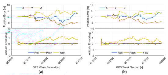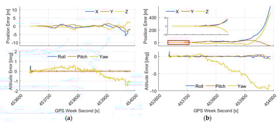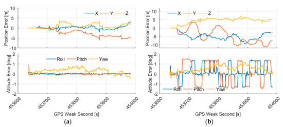 The root-mean-square errors (RMSEs) of the estimated position, horizontal attitude, and yaw were calculated by comparing the estimated states with the ground truth data. All results are listed in Table 2, Table 3 and Table 4. Because all states were estimated from noisy sensor measurements by joint optimization, the final results were random due to the keyframe selection method and the change of the initial condition. However, the variation tendency of RMSEs was still obvious under different settings, especially for the RMSEs of the POS620 due to its high-precision measurements. The estimation results were diverged under Setting B and Setting D if the POS620 measurements were used in our implementation. Therefore, the RMSEs are not listed in Table 4. Additionally, the diverged estimation errors of POS620 are plotted in Figure 5.