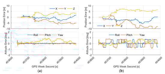 According to the RMSEs of the horizontal attitude of the MTi-G-710 and POS620 under Setting A and Setting C presented in Table 2, Table 3 and Table 4, we can observe that ignoring the change of gravity makes the horizontal attitude errors increase as the geodetic displacement increases linearly. The RMSEs of the horizontal attitude error are about 1.38 times greater than the geodetic displacement. This tendency is also obvious in Figure 8b and Figure 9b, where the pitch and roll errors fluctuate sharply. If the vehicle moves in a small area, i.e., the geodetic displacement is almost 0 degrees, ignoring the change of gravity does not have much of an influence on the horizontal attitude errors, as shown in Table 2, Table 3 and Table 4, under Setting C. This phenomenon can also be directly observed in Figure 7.