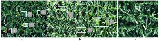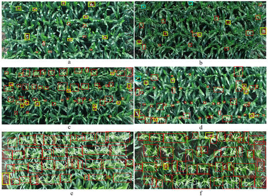 It was found that the detection effect was related to the tasseling stage of breeding plots, when analyzed the detection accuracy. Therefore, the tasseling stage of breeding plots were divided into early, middle and late tasseling stages according to the proportion of tasseling plants and whether the tassels have complete morphological characteristics. The definition of tasseling stages are as follows: tasseling proportion is less than half is early tasseling stage (Figure 11a,b); tasseling proportion is more than half, but most of them do not have complete morphological characteristics is middle tasseling stages (Figure 11c,d); tasseling proportion is more than half and tassels have complete morphological characteristics is late tasseling stage (Figure 11e,f).