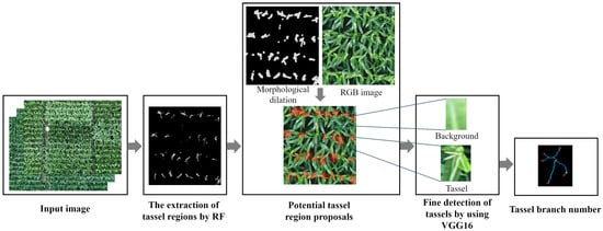 In view of the problems to be solved and the challenges faced, we proposed an automatic tassels detection method combining RF and VGG16 network. Figure 3 shows the main process of this method. First, RF classifier was used to conduct pixel-based supervised classification of UAV images. The advantage of this process is that we can find tassels of any size, but it would also cause problems such as interference pixels and unconnected tassel regions; therefore, the morphological dilation method was used on unconnected regions belongs to tassels and noises, which are called the potential tassel region proposals; In the process of RF classification, pixels of other categories may be misidentified as tassels, so the potential region proposals have some wrong connected regions. To reduce the false positives, we used VGG16 network to re-classify the potential tassel region proposals and obtain accurate detection results; finally, we explored how to extract branch number of detected tassels.