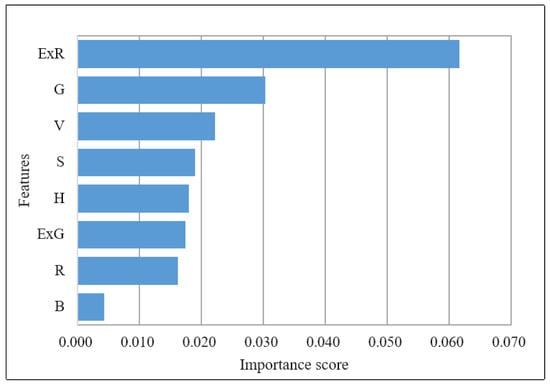 According to the characteristics of the RF classifier, the importance of features could be evaluated. We applied the permutation importance method based on test set, which was evaluated by permuting the column values of a single feature, rerunning the trained model, and then calculating accuracy change as importance score [,]. This method is more reliable than the Gini importance []. The rfpimp package with python was used to complete this, and the feature importance obtained is shown in Figure 5. It can be found that ExR has the highest importance score, followed by G (green band), while the B (blue band) has the lowest importance score. Figure 6b shows the classification results of the UAV image, and tassels’ morphological characteristics are well displayed. After this, other categories except tassel were selected and integrated together to obtain binary image of tassels (Figure 6c), called tassel regions.