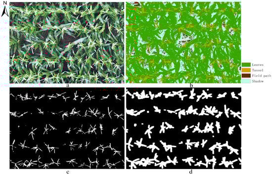 In the complex field environment, the mutual occlusion between top leaves and tassels is serious, leading to the fact that tassels in the binary image obtained in Section 2.3.1 were not connected regions (Figure 6c), and there is also the problem that other categories’ pixels were misidentified as tassels.
