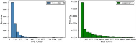 We found that many labeled samples contained less surrounding information due to the small area of the envelope rectangles, making it difficult for human eyes to recognize these samples. As shown in Figure 7, all the samples were labeled with human recognition attribute (called recognition), and analyzed the distribution of envelope rectangles’ pixel number. Almost all of (96%) the envelope rectangles out of unidentifiable samples (recognition = 0) are smaller than 600 pixels, so the envelope rectangles were expanded to 600 pixels according to the aspect ratio before put into VGG network, so that more information can be included. Although nearly half of the envelope rectangles out of identifiable samples (recognition = 1) are less than 600 pixels, after verification, almost all of these samples are non-tassel regions, which means they could be recognized because of their special color.