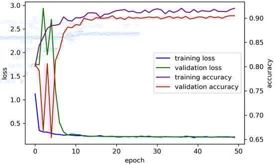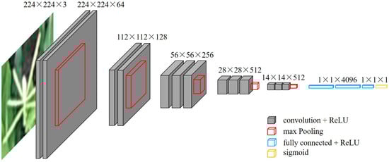 VGG16 network structure was selected in this paper, and we used the weight parameters from ImageNet’s pre-training model, to achieve better training results and reduce the running time. This study deals with binary classification, so replace the activation function of the output layer with the sigmoid (Figure 8). The ratio of training set to validation set was 7:3. To prevent overfitting due to limited samples and improve the model’s generalization, data augmentations through small random transformations with rotate and flip were used. The model’s iteration and batch size were 50 and 64, respectively, initial learning rate was 0.001 and adopted the learning rate decay strategy. We fine-tuned the obtained optimal model by releasing the deep network parameters, to make the model parameters more consistent with the data in this study.
