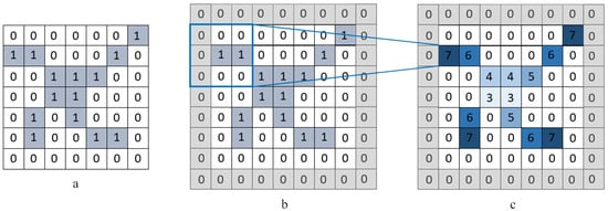 Endpoint detection of tassels. (a) 0, 1 matrix of tassel skeleton. (b) Matrix after applied padding, the blue box is a 3 × 3 window. (c) Pixel with the deepest color are the endpoints of tassel.