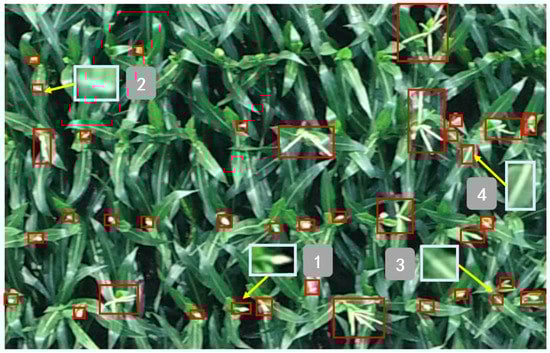 Detailed diagram of detection results. Red boxes represent automatically detection by proposed method, (1) the newly grown tassels; (2) reflective leaf was misidentified as tassel; (3) and (4) leaves vein were misidentified as tassels.