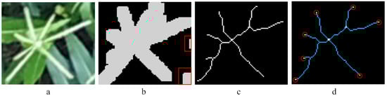 The calculation of tassel branch number. (a) Original image. (b) Binary image after morphological dilatation. (c) Tassel skeleton. (d) Endpoint detection.
