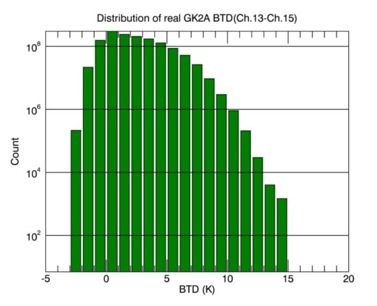 To set the threshold value of the LST algorithm, the distribution of brightness temperature differences (BTD) between channel 13 and channel 15 of GK2A was analyzed. This time, only the land pixels without clouds were analyzed. The analysis dates were selected as the same day each month from July 2019 to October 2019, and the count of BTDs accumulated was observed every 10 min. Figure 3 shows the frequency of BTDs between channel 13 and channel 15 of GK2A. BTD values were distributed from −3 K to 15 K. Most of the BTDs were counted at over 10 million from 1 K to 7 K. The results showed a similar distribution to that of the RTM simulated results, which are shown in Figure 4. Figure 4 shows the BTD distribution between channel 13 and channel 15 of GK2A from the simulated pseudo match-up database with the RTM. The coefficients of the LST equation (Equation (1)) were obtained from the simulated pseudo match-up database by regression analysis. Using these coefficients, the root mean square error (RMSE) values between the reference LST and the estimated LST were calculated. Overall, the distribution of simulated BTDs was similar to that of the actual GK2A BTDs, except for the −3 K to 0 K range. The RMSE value was relatively large when the simulated BTD value was less than −1 K or greater than 6 K. The difference between the actual GK2A BTD and the RTM simulation BTD was less than 0 K. This difference could have been caused by the small amount of aerosols given the atmospheric profile (SeeBor_v5), which was used for the RTM simulation []. Using these results, the threshold values of BTD for dry/normal/wet conditions were determined to be 0 K and 6 K, respectively.