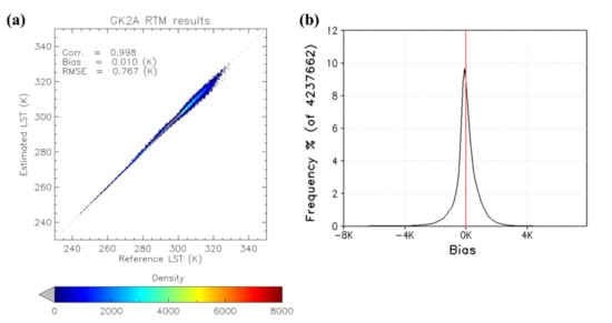 As a result of evaluating the output level of the LST calculated by the RTM simulation using the prescribed LST, there was a correlation coefficient of 0.998, a bias of 0.01 K, and an RMSE of 0.767 K. When the BTD value is larger than 6 K and the satellite’s VZA is large, the RMSE is large, but the error is relatively smaller than the result of using the linear algorithm of the previous study [].