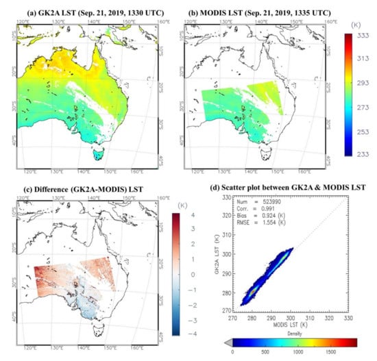The spatial distribution of the two LSTs and their differences, along with the scatter plot on 21 September 2019, are shown in Figure 9. The observation time of the two LSTs differs by 5 min. The spatial distribution of the two LSTs is generally similar, but the spatial distribution of the difference between the two LSTs showed a warm bias in the desert region of Australia’s inland but a cold bias in south Australia. As shown in the scatter plot, the overall GK2A LST was higher than the MODIS LST in all ranges (270–305 K). As a result, the GK2A LST shows a warm bias of 0.924 K and an RMSE of 1.554 K.