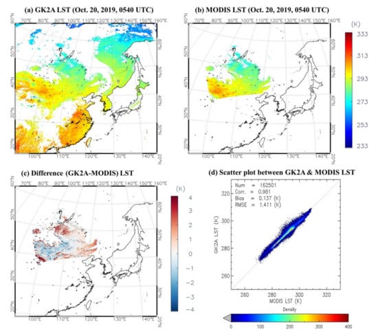 As described in Section 2.1.2, MODIS Collection 6 LST data and BSRN Tateno station data were used for the validation of GK2A/AMI LST. The spatial resolution of the MODIS LST was 1 km. The MODIS LST data were provided at 5 min intervals as Terra/Aqua satellites moved along their orbits. Due to the characteristics of LST with large spatial-temporal variability, strict spatial-temporal collocations are needed. For temporal collocation, the MODIS LST data within 5 min were used based on the observation time of GK2A, as in previous studies []. For the spatial collocation, a simple mean of the nearest 9 MODIS pixels (an average of 3 × 3) surrounding the closest MODIS pixel to the GK2A pixel was used. Validation with MODIS LST data was performed when the pixels had more than five pixels of clear sky and land.
