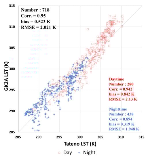 To evaluate the the GK2A LST algorithm, we conducted a quantitative validation of the GK2A LST using in situ observation data. As mentioned in Section 2.1.2, the upward longwave radiation data observed at the Tateno station of the BSRN were used as validation data. Approximately 718 sets from July 2019 to October 2019 satisfying the spatial-temporal matching conditions with the GK2A LST were used for the validation of the GK2A LST. In addition, the performance of the GK2A LST algorithm was evaluated according to daytime and nighttime. The validation results of the GK2A LST with the data from Tateno station are shown in Figure 11. The GK2A LST is similar to or slightly warmer than the ground observed LST at Tateno station, regardless of the temperature and time (day and night). The total correlation coefficient, bias, and RMSE between the GK2A LST and the Tateno LST were 0.95, 0.523 K, and 2.021 K, respectively. However, the GK2A LST was warmer than the ground observed LST; in particular, the LST was greater than 305 K during the daytime. As shown in Figure 11, the GK2A LST shows a greater warm bias (0.84 K) and RMSE (2.13 K) during the day than at night (bias: 0.32 K, RMSE: 1.948 K).