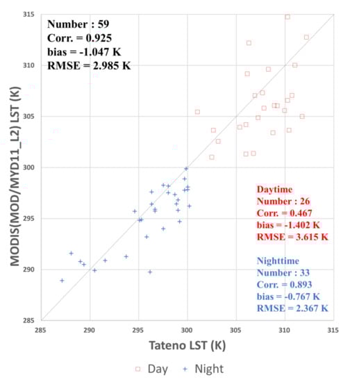 To compare the accuracy of the MODIS LST, it was validated using the LST at Tateno station for the same period as the GK2A LST. The validation results of the MODIS (MOD11/MYD11_L2) LST with those from Tateno station are shown in Figure 13. The MODIS LST was slightly colder than Tateno LST, regardless of the daytime and nighttime. The total correlation coefficient, bias, and RMSE between MODIS LST and Tateno LST were 0.925, −1.047 K, and 2.985 K, respectively. Although the number of samples was small, the MODIS LST showed a cold bias compared to the in situ LST in both daytime and nighttime. In particular, the daytime bias (−1.402 K) of the MODIS LST was nearly twice that of the nighttime (−0.767 K). In the comparative validation results of the GK2A LST and the MODIS LST, the reason why the warm bias of GK2A is large during the daytime is also considered to be related to the cold bias of MODIS LST during the daytime.