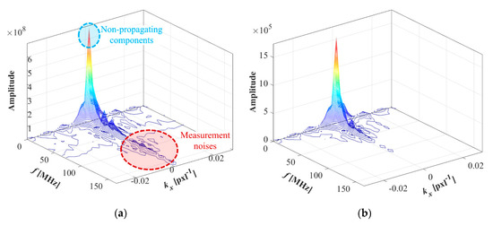 Once the f–k filter is designed, the filtered SR C-scan data () can be obtained in the f–k domain. Figure 3b shows that the measurement noises, as well as non-propagating components, are clearly filtered out, and meaningful wave components remain.