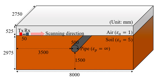 The target 3D model is comprised of 8 × 2.975 × 2.75 m3 soil layer, 8 × 0.525 × 2.75 m3 air layer and steel pipe with a diameter of 500 mm, as depicted in Figure 4. It was modelled so that the pipe was buried perpendicular to the GPR scanning direction inside the soil layer. Note that the pipe was intentionally selected in this study, because it is one of the representative wave scatters which can be clearly reflected in all GPR channels constituting the C-scan images. Here, the relative permittivity values of air, soil and pipe were set to 1, 5 and infinity, respectively. The transmitter (Tx) was 50 mm apart from the receiver (Rx), and the GPR data reflected from the pipe were acquired by moving the Tx and Rx antennas along the soil layer surface, as shown in Figure 4. A finite difference time domain method [44] was used to simulate electromagnetic wave propagation. To simulate the similar conditions with the real-world GPR scanning, the spatial discretization was set to 20 mm, which is equivalent to 20 km/h scanning speed with 20 GPR channels in the real-world application. Here, the 20 GPR channels are able to cover a road width of 1.5 m. The excitation electromagnetic wave was normalized by the second derivative of a Gaussian waveform with a center frequency of 1.8 GHz. In addition, Gaussian random noises, which are equivalent to 25% of magnitude of the maximum value of the GPR signal, were artificially added to simulate the arbitrary underground medium inhomogeneity and undesired measurement noises.