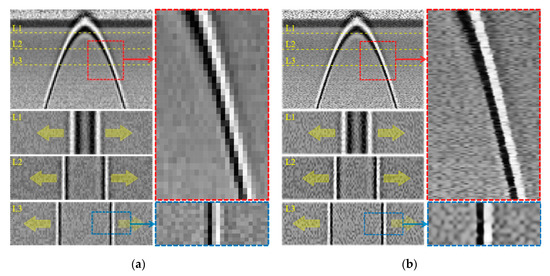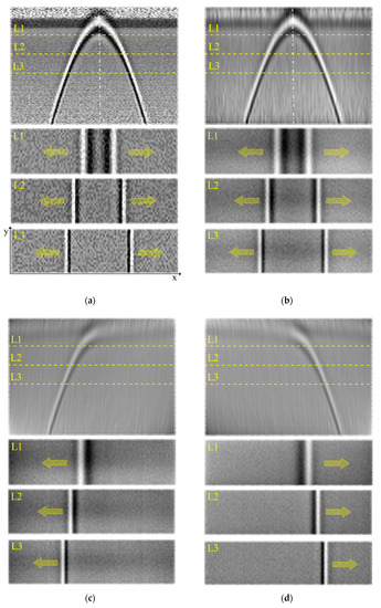 Figure 10a and Figure 11a show the representative experimental results including B- and C-scan images obtained from two different underground pipes that are defined as pipe cases 1 and 2. Compared to the simulation results of Figure 5a, the experimental LR images show lower resolution and more noises which are most likely caused by arbitrary underground medium inhomogeneity and undesired measurement noises. In particular, the B- and C-scan images of Figure 10a and Figure 11a do not have sufficient pixel resolution for the f–k analysis. On the other hand, the SR B- and C-scan images reveal that informative edges of the parabola and line features are well reconstructed without pixel information loss and distortion, as displayed in Figure 10b and Figure 11b.