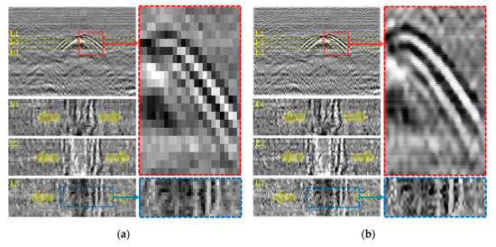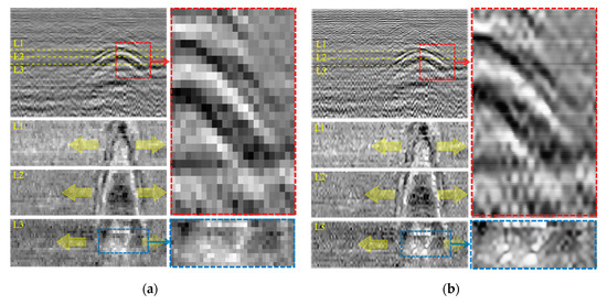 Figure 5 shows the representative GPR B- and C-scan images obtained from the simulation model. The original LR B- and C- scan images are clearly shown in Figure 5a, although the relatively slow scanning of 20 km/h with dense GPR channel arrangement was modelled in this simulation. On the other hand, the SR B- and C-scan images show that the edges of informative parabola and line features are well enhanced without pixel information loss and distortion, as displayed in Figure 5b. Although the image resolution is successfully enhanced, the arbitrary underground medium inhomogeneity and undesired measurement noises still remain in Figure 5b.