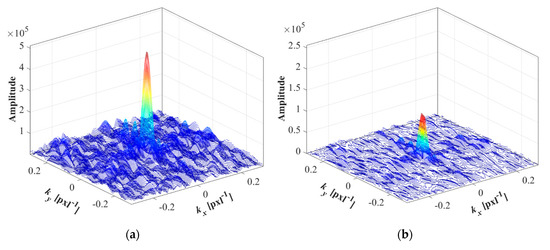 Subsequently, the tailored f–k filter is designed. First, a lowpass filter is applied in the f domain so that the measurement noises can be eliminated outside the excitation frequency range as shown in Figure 3. The filtering frequency bandwidth can be determined by considering the excitation frequency range. The k domain filter is then developed. Since the electromagnetic waves propagating along arbitrary underground media are partially and randomly reflected from the media’s inhomogeneity and numerous small porosities, these reflection signals randomly appear and look like non-propagating wave components in the C-scan images of the t–s domain. It physically means that no spatially propagating wave can be observed if there is no certain object inside the underground media. Even if there are meaningful signals reflected from a certain object, such physical phenomenon can be clearly observed, as shown in Figure 3a. The wave energy is highly concentrated near zero value, which are undesired noise components to be eliminated. One more interesting thing to see here is that these randomly reflected signals in the f–k domain may have dominant energy due to their high repetition rate, although each reflection signal intrinsically has small amplitude. Based on the physical observation, the k domain filter is established using a Laplacian of Gaussian window ():