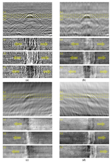 In the past few decades, sinkhole accidents of urban roads have posed a serious hazard to buildings, infrastructures and especially inhabitants of the area [1,2]. Although vision-based road surface inspection techniques have been widely proposed for road degradation evaluation [3,4], early detection of sinkholes, which are typically invisible from the road surface, is still challenging. To effectively detect underground cavities which are most likely extended to sinkholes, various nondestructive testing (NDT) techniques have taken the limelight. Ground penetrating radar (GPR) is one of the widely accepted NDT tools thanks to its high sensitivity to underground media change and rapid inspection capability for broad target areas [5,6,7]. However, the physical interpretation of field GPR data for underground object detection and classification is still challenging in some cases, because electromagnetic waves, which are reflected from a target underground object, are often weaker than underground media’s inhomogeneity and undesired measurement noises [8,9]. In general, most of the dominant signals reflected from the road surface often hinder the precise data interpretation of relatively weak signals coming from underground media under air-coupled GPR data acquisition conditions [8,10,11].