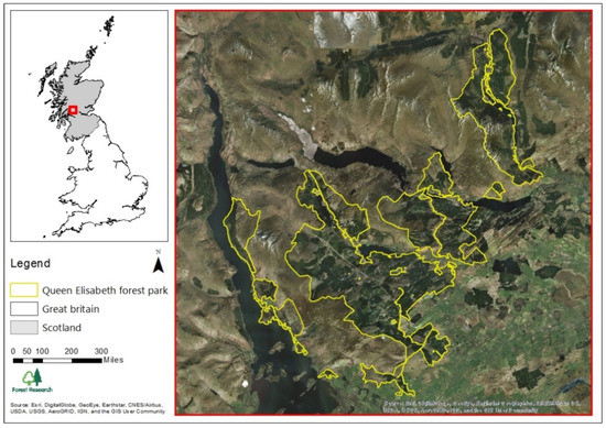 The study area was located within the boundaries of the Queen Elizabeth Forest Park (19,665 ha), near Aberfoyle village, Scotland (Figure 1). This area is part of the Loch Lomond and Trossachs National Park and has been widely used as a research forest by FR. The area is characterized by large natural forests and forest plantations. Main forest types, according to the most recent (2016) National Forest Inventory (NFI), are ‘conifer woodlands’ (9001.34 ha) and ‘broadleaved and mixed woodlands’ (1547.76 ha). There is a clear predominance of plantations of Sitka spruce (Picea sitchensis) (5351 ha) with smaller areas of Pinus contorta (468 ha) and Quercus petreae and robur (612 ha).