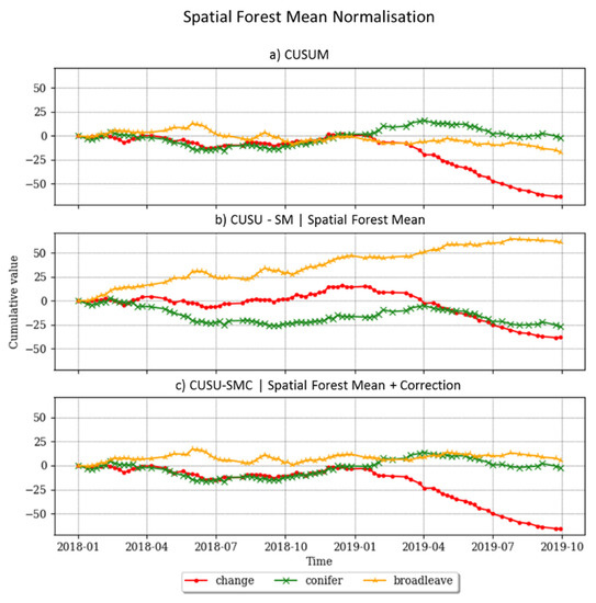 Spatial mean normalization. Ratio of backscatter variation of each class (‘forest’, ‘conifer’, ‘broadleaves’) for the entire timeseries, based on the cumulative sum methodologies; (a) CUSUM based on [46], (b) CUSU-SM spatial forest mean variant, (c) CUSU-SMC proposed method (spatial mean constant bias correction applied).