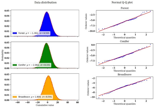 In this section we want to test the assumption that the CUSUMs obey a Gaussian zero mean distribution. We decided to determine normality by investigating graphically the output of data histograms and quantile–quantile plots. The results obtained for each of the three classes “forest”, ”conifer”, and “broadleaves” provided enough evidences to ensure the data is normally distributed. As can be seen in Figure 5, histograms highlighted a close approximation of the data to the theoretical bell curve distribution; while in the Q–Q plots data points appeared closely distributed along the diagonal line.