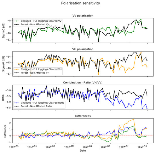 The temporal trend for VV, VH, and the ratio are showed in Figure 6. Data were filtered with a 3 × 3 boxcar filter. The last row of Figure 6 shows the backscatter differences between the stable forest areas and the logging areas for the VV, VH and its ratio.