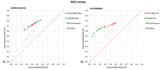The CUSUM method [46], showed the best results for the VH polarization channel (OA = 73.6%; F = 69.5%), providing a medium to high performance in the detection of true positives (TP = 60.2%) and a significantly high performance in the rejection of false positives (FP = 13.0%). Similarly, the proposed CUSU-SMC also showed its higher performance with the VH polarization channel (OA = 65.7% and F = 68.0%), offering a high performance in detecting true positives (TP = 72.4%), but a relatively high false alarm rate (FP = 40.6%). The ratio (VH/VV) combination provided a good performance for both CUSUM (F = 68.7%) and CUSU-SMC (F = 67.4%) methods. Finally, the impact of ground on the co-polarized channel (VV) provided the lowest separation between forest and deforested areas.