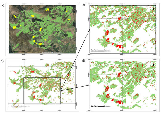 Forest changes detected in the Queen Elizabeth Forest Park using the conservative strategy (CUSUM VH). (a) Shows the logging activities reference dataset obtained for the period of study. (b) Illustrates the changes detected (red) for the CUMSUM VH (avg 3 × 3) detector. Subsets (c,d) show a closer look of the effect of the sieve filter on the final change detection maps [(c) 10 pixels; (d) 25 pixels].