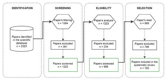 We selected the papers according to their scope and objectives, and characteristics such as the geographic area mapped, sampling strategy, number of samples and classes, classification method, and accuracy. We especially selected papers of the agricultural or natural vegetation domain because of their dynamics and heterogeneity, favoring innovative and reproducible methods that permit the reasoning about landscape dynamics, considering the capability to distinguish different classes. We previously selected 989 papers, and we included 193 of them in this systematic review (Figure 1).
