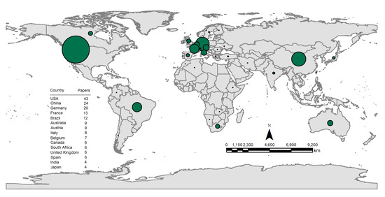 Global distribution of the research groups responsible for the papers selected, highlighting the 15 countries with the greatest number of publications.