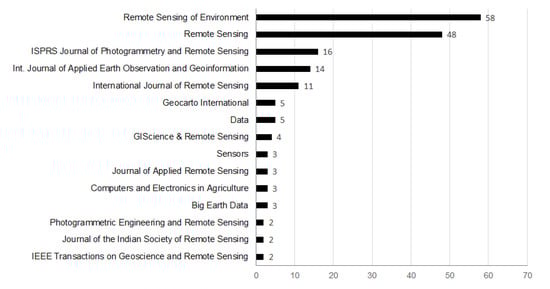 The main sources of the 221 peer-reviewed publications were the journals: Remote Sensing of Environment ( 58 papers), Remote Sensing ( 48 papers), and ISPRS Journal of Photogrammetry and Remote Sensing (16 papers). The top 15 journals are presented in Figure 3.