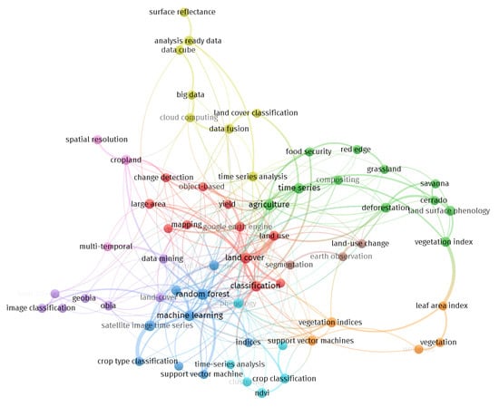 We noted the prevalence of SITS, multi-temporal analysis, and two principal classification approaches: (a) Pixel-based, by using SITS for monitoring pixel trajectories along the time, and (b) Object-based, by the geographic object-based image analysis (GEOBIA), evaluating pixel neighborhood relations for segmentation and classification, which are often used in conjunction with robust machine learning algorithms. We observed the growing use of phenological metrics and deep learning methods. The text mining analysis highlighted the occurrence and link strength of each term (Figure 4).