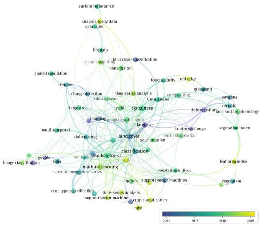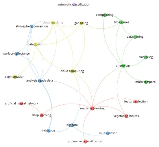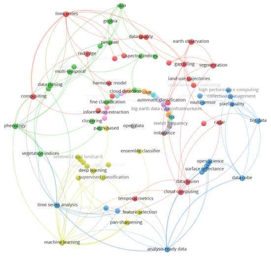 The network reveals a high connection among relevant and different features, techniques, and methods used as a strategy to address LULC-related purposes. The strength of the connections reinforces the association of ’land use’, ’land cover’, and ’land use change’ with ’machine learning’ techniques, ’time series analysis’, and object-based (’OBIA’, ’GEOBIA’, ’segmentation’) approaches, as well as ’surface reflectance’, ’big data’, ’data fusion’ (’analysis-ready data’, ’data cube’), ’vegetation indices’, and ’data mining’ for ’image classification’. By text mining, it was also was possible to detect the evolution of the research terms occurrence throughout the period of analysis (Figure 5).