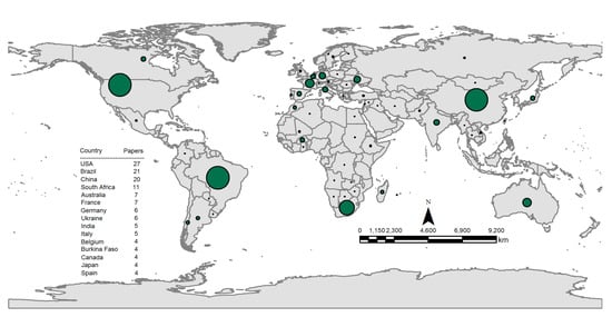 Global distribution of the study areas considered for applications in the selected papers, highlighting the 15 countries with the greatest number of publications.