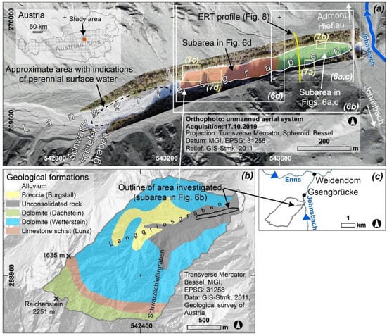 The Langgriesgraben investigation area (a), modified photograph acquired on 31 July 2006 by the company zepp-cam (zepp-cam.at). The western section of the Langgriesgraben from an unmanned aerial system’s perspective (b), viewing direction: west, in the background (left) the mountain Admonter Reichenstein (2251 m, photo acquisition: 9 August 2019, G. Seier/S. Schöttl/W. Sulzer). Evidence of surface water (viewing direction: north-east) nearby the area investigated (c), photo acquisition: 6 June 2020, R. Glück. The Langgriesgraben photographed from the bridge (d), for location see (a), acquired on 7 September 2007 by Reinhard Thaller and acquired on 18 July 2009 by Harald Haseke (e).