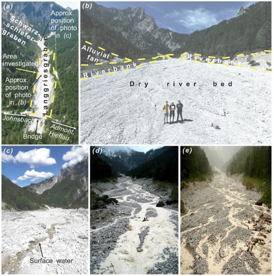 Fluvial landforms are of great importance from an ecological and economical perspective. Fluvial processes vary greatly in size, dimension, and intensity: floods regularly threaten engineered constructions and even human lives, while plenty of small-scale, short-term changes often go unrecognized. Riverine landforms form where water runs as overland flow and streamflow in river channels, which is based on runoff production as the difference between precipitation and evaporation rates [] and relates to the removal and transfer of Earth surface materials []. In this study, we focus on the lower section of the gravel-bed braided mountain torrent Langgriesgraben, which is affected by high geomorphic activity related to periods of intermittent discharge.