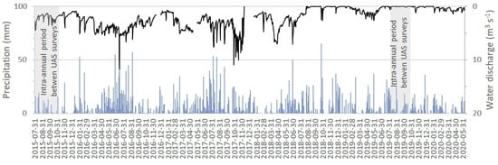 Within the Langgriesgraben area, this study focuses on a section of 1.1 km in length reaching from the bridge close to the Johnsbach River to the junction with the Schwarzschiefergraben entering from the south (Figure 1a and Figure 2a). The riverbed of the Langgriesgraben is a highly active geomorphological area [,,,], that has been influenced by gravel mining over the course of several decades, which began at least in the 1970s but probably even after World War II []. In 2009 and 2010 renaturation measures were carried out []. Since then, the Langgriesgraben has been undergoing natural processes of erosion and deposition of unconsolidated sediments [,]. The alluvial channel of the Langgriesgraben is characterized by braided structures (Figure 2). Surface runoff is prevalent on only a few days per year caused by rainstorms, which result in flash floods (see Figure 2d,e personal correspondence with local residents and the Gesäuse National Park management). Indications for perennial surface runoff, which are based on field evidence of observations in October 2019 as well as May and June 2020, are evident a bit uphill of the area investigated (Figure 1a). During the period of the study’s measurements (31 July 2015–06 June 2020) the precipitation at the nearest rain gauge (Weidendom) was characterized by seasonal variations with clear maxima (of up to ≈65 mm d−1) in the summer months (Figure 3). Water discharge measurements at the nearest water gauge (Gsengbrücke) reflect the seasonality of discharge with maxima of up to ≈11 m3 s−1, even though the measurements appear distorted as of September 2018 because in the former years water discharge was detectable throughout the entire period (Figure 3), and which is a known issue caused by bedload (personal correspondence with the gauge maintaining personnel).