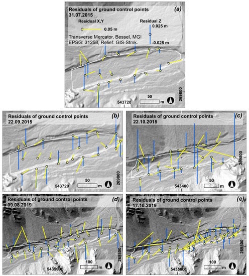Residuals of ground control points (planimetric residuals in yellow and height component in blue, see legend in (a)) for each flight campaign covering different subsections of the study area: July 2015 (a), September 2015 (b), October 2015 (c), August 2019 (d), October 2019 (e).