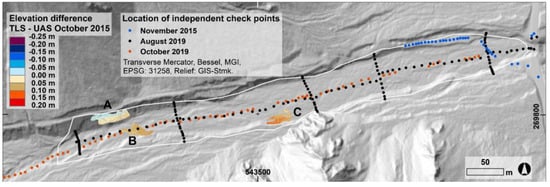 The comparison was conducted using DEM differencing. The UAS-based DEM was subtracted from the TLS-based DEM. In the subareas B and C, a systematic offset of the UAS data can be observed (Figure 5). This visual interpretation is confirmed by a clear positive mean difference for these two small sites (Table 3), which indicates that the UAS-based elevations are generally slightly lower than the TLS-based elevations. Details of the data preparation are presented in [].