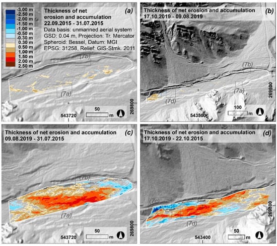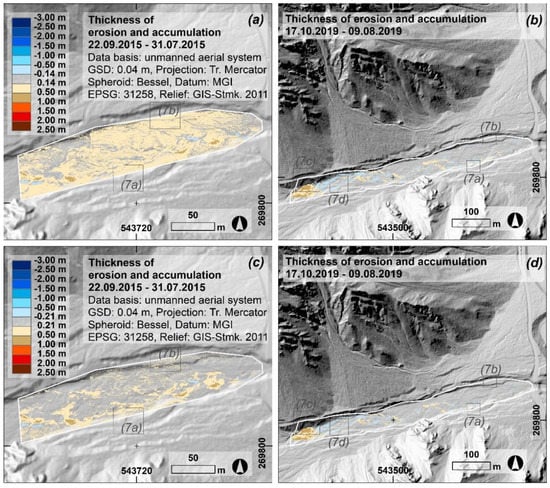 Changes of loose sediments in the Langgriesgraben: Areas of net erosion and net deposition in the central and most eastern section of the Langgriesgraben in (a) July and September 2015, (b) August and October 2019, (c) July 2015 and August 2019, and (d) October 2015 and October 2019. For location of the subsets see Figure 1.