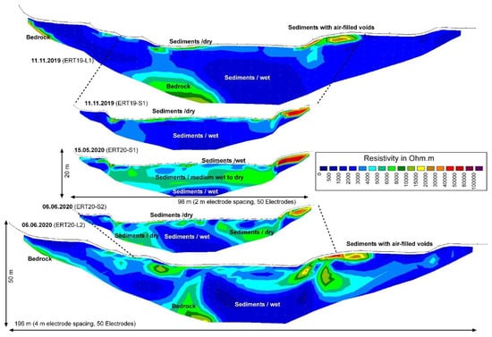 The ERT measurements give insight into the changes of subsurface water conditions between November 2019 and June 2020 (Figure 8). According to [], resistivity values in the range of 100 (humid and fractured limestone) to >100,000 Ωm (very compact limestone) can be expected for limestone rocks. [] measured resistivity values of 10,000–30,000 Ωm for unfrozen and compact Wetterstein limestone. Furthermore, the authors of [] measured 3000–28,000 Ωm for compact and unweathered Dachstein limestone. The two long profiles measured in November 2019 and June 2020 revealed bedrock at the southern end and along the first third of the profile with values exceeding 10,000 Ωm, which is a reasonable estimate value for fractured limestone and dolomite as outlined above. The sediment thickness at the southern section of the long profiles is in the order of 20 m, whereas at the northern section sediments exceed depths of 30 m. The superficial layer of higher resistivity values is related to dry sediments with air voids in between. In November 2019, this layer was about 2 m thick at the streambed covering a groundwater-filled sediment body. On 15 May 2020, the upper 10 m of the sediments in the riverbed dried out causing a lowering of the groundwater table as indicated by values exceeding 4000 Ωm. However, close to the surface (i.e., upper 5 m) the sediments revealed higher resistivity values compared to November 2019 indicating moistening. About 3 weeks later (6 June 2020), subsurface conditions changed again with lower resistivity values also closer to the surface of the streambed indicating an increase of the water table. However, the comparison of the November 2019 data (both short and long profiles) with the June 2020 data shows that the subsurface channel was more water-saturated in late autumn compared to late spring and early summer.