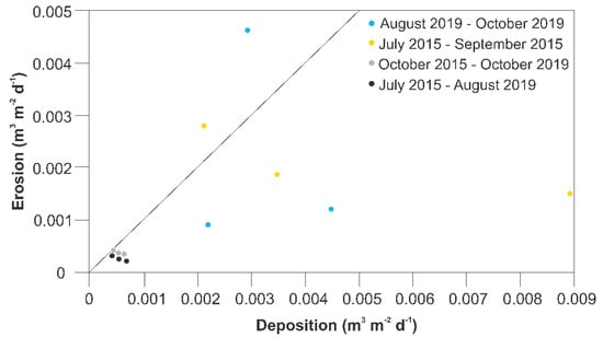 Volume of eroded and deposited loose sediments related to the different reshaped areas and time periods (July–September 2015 and July 2015–August 2019 are related to the lowest section, whereas the comparison of October UAS-based data is related to the upper section of the study site and the intra-annual comparison of 2019 is related to the entire study area). The different values for the same dates result from the threshold used for elevation differences of ±0.30 m, i.e., the intermediate point depicts the result irrespective of uncertainty considerations.